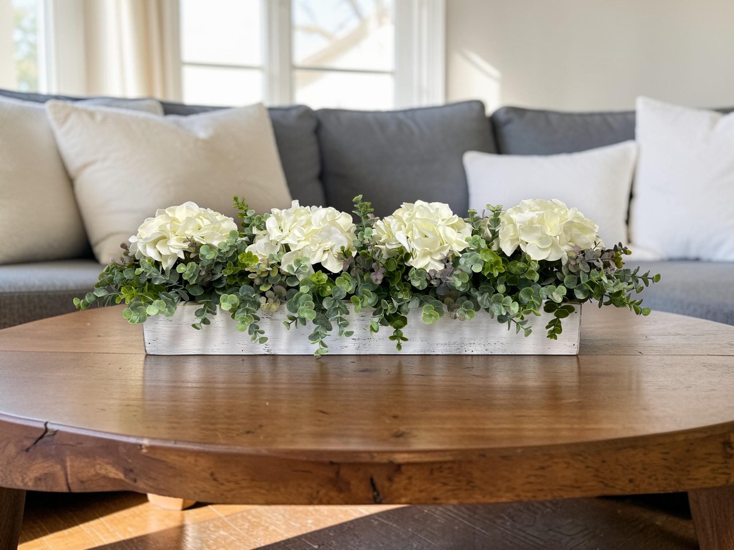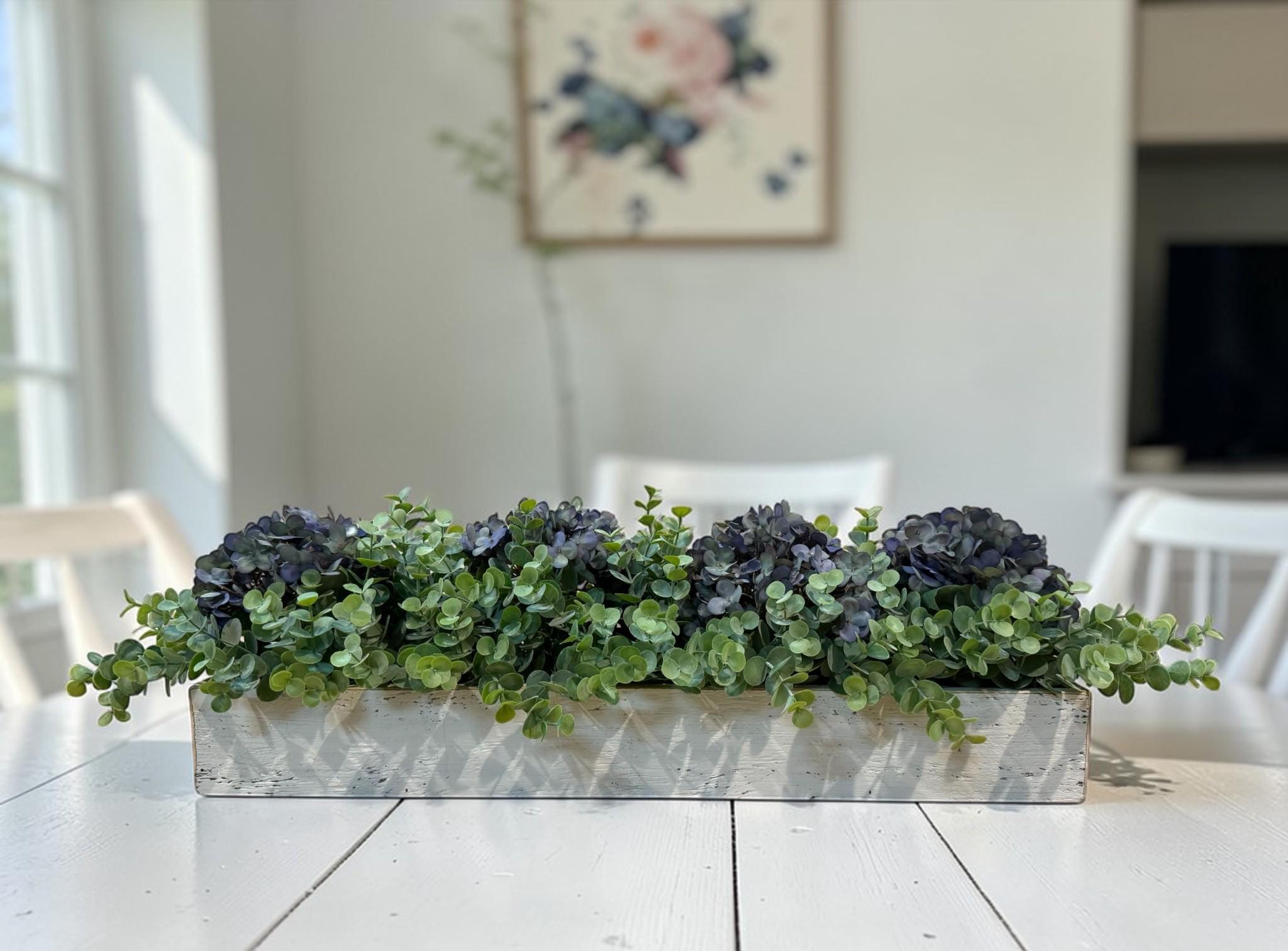 Farmhouse Wood Tray Centerpiece with Hydrangeas & Eucalyptus