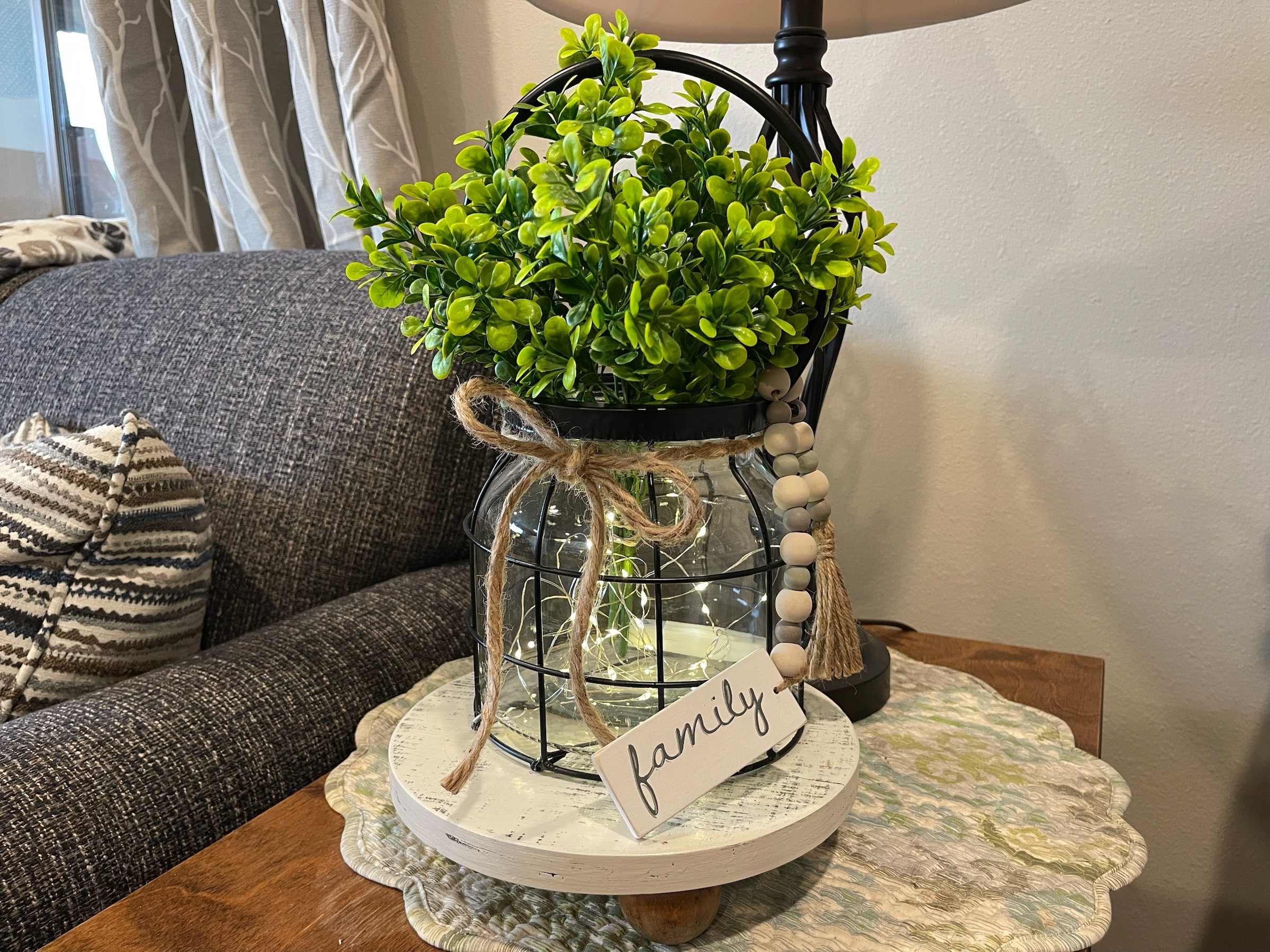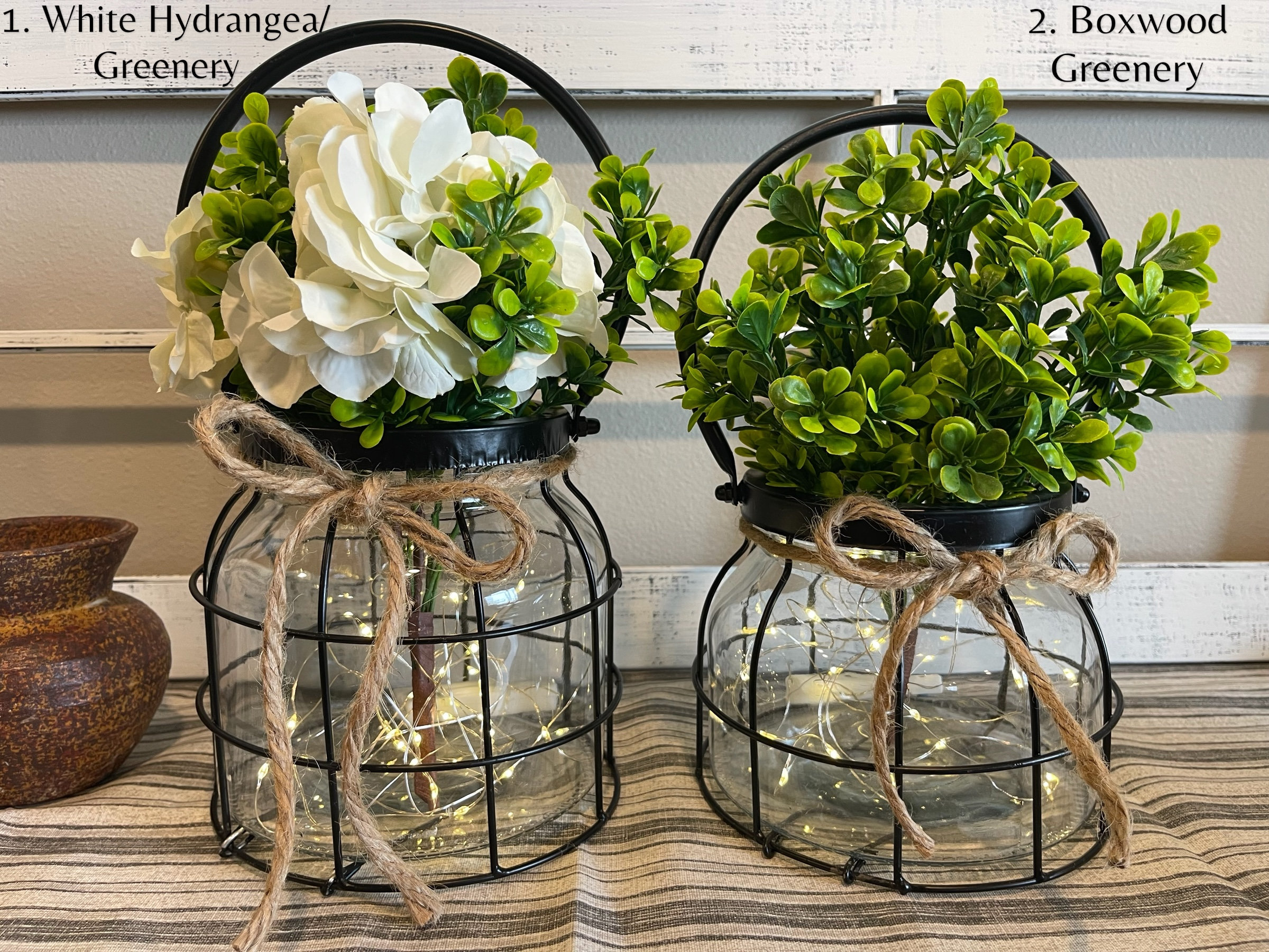 This Black Metal Lantern is wrapped around a Glass Jar and includes a natural jute bow. The Florals and Lights are removeable so you can change it up with the seasons.