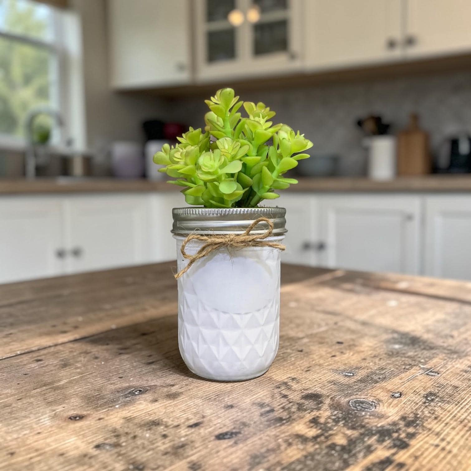 Artificial Succulent Plant in Quilted Mason Jar – Farmhouse Decor, Rustic Greenery