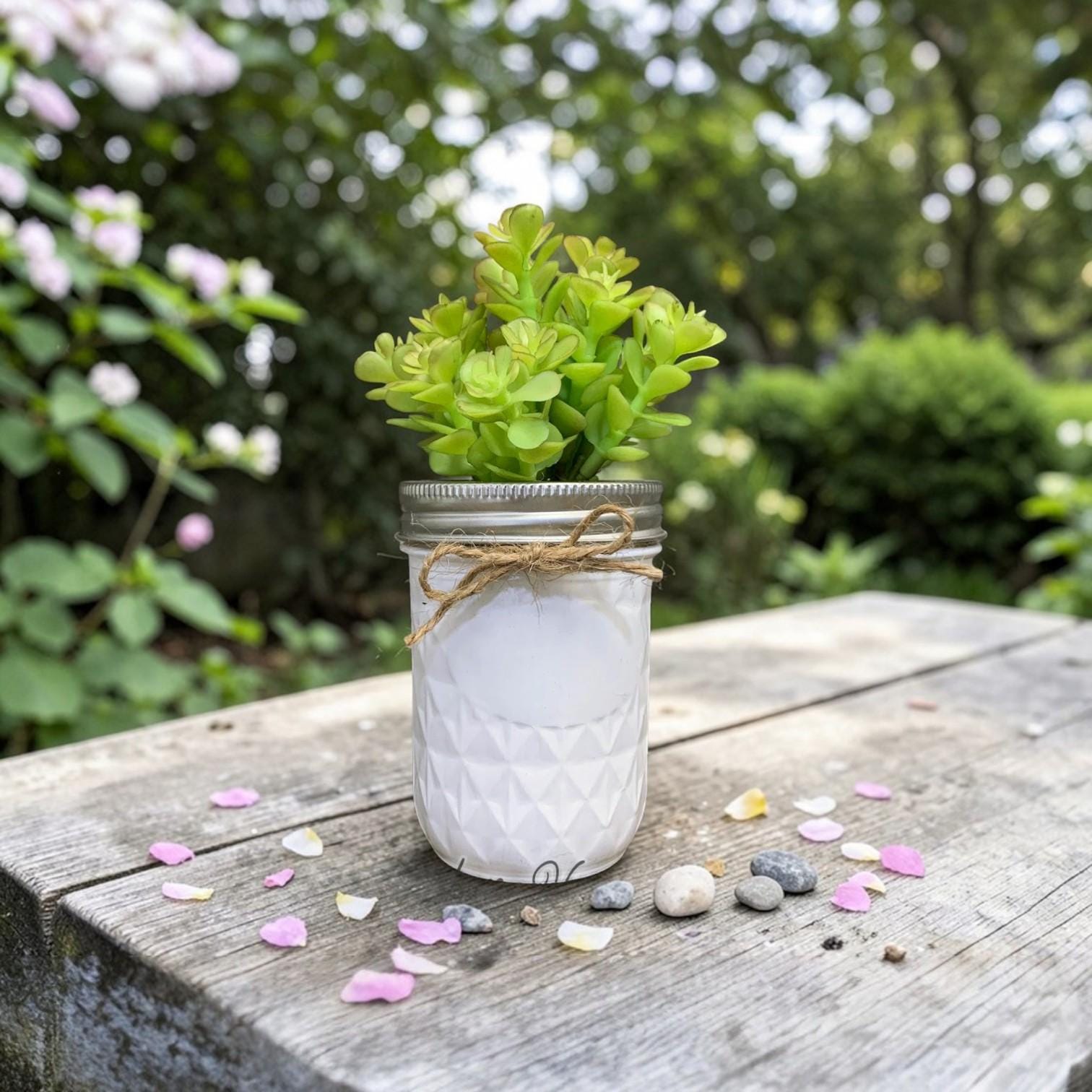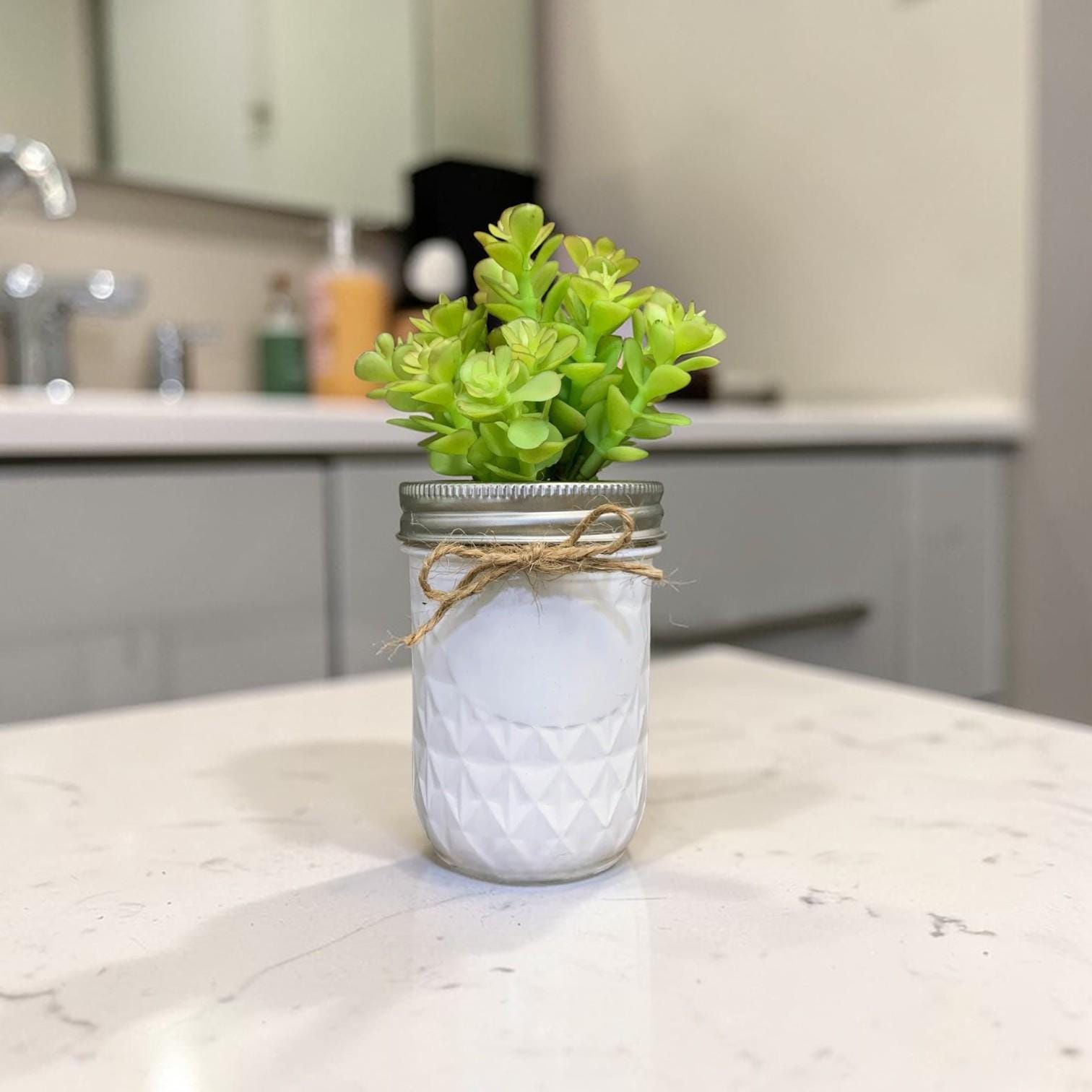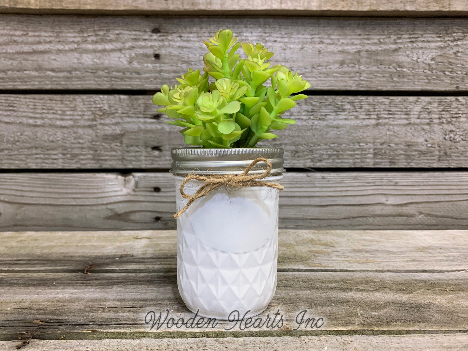 This is for one beautiful succulent plant in a half pint quilted ball mason jar! The succulent is artificial, but you will be surprised at how REAL it LOOKS and feels! There is a metal canning jar ring around the top, as well as a jute bow. Inside the jar is raffia to complete this adorable farmhouse look! The jar is hand-painted white and has been sprayed with a coat of lacquer to protect the finish. This is perfect for bridal showers, baby showers, sympathy gifts, Mother's Day, and to set anywhere in your home!