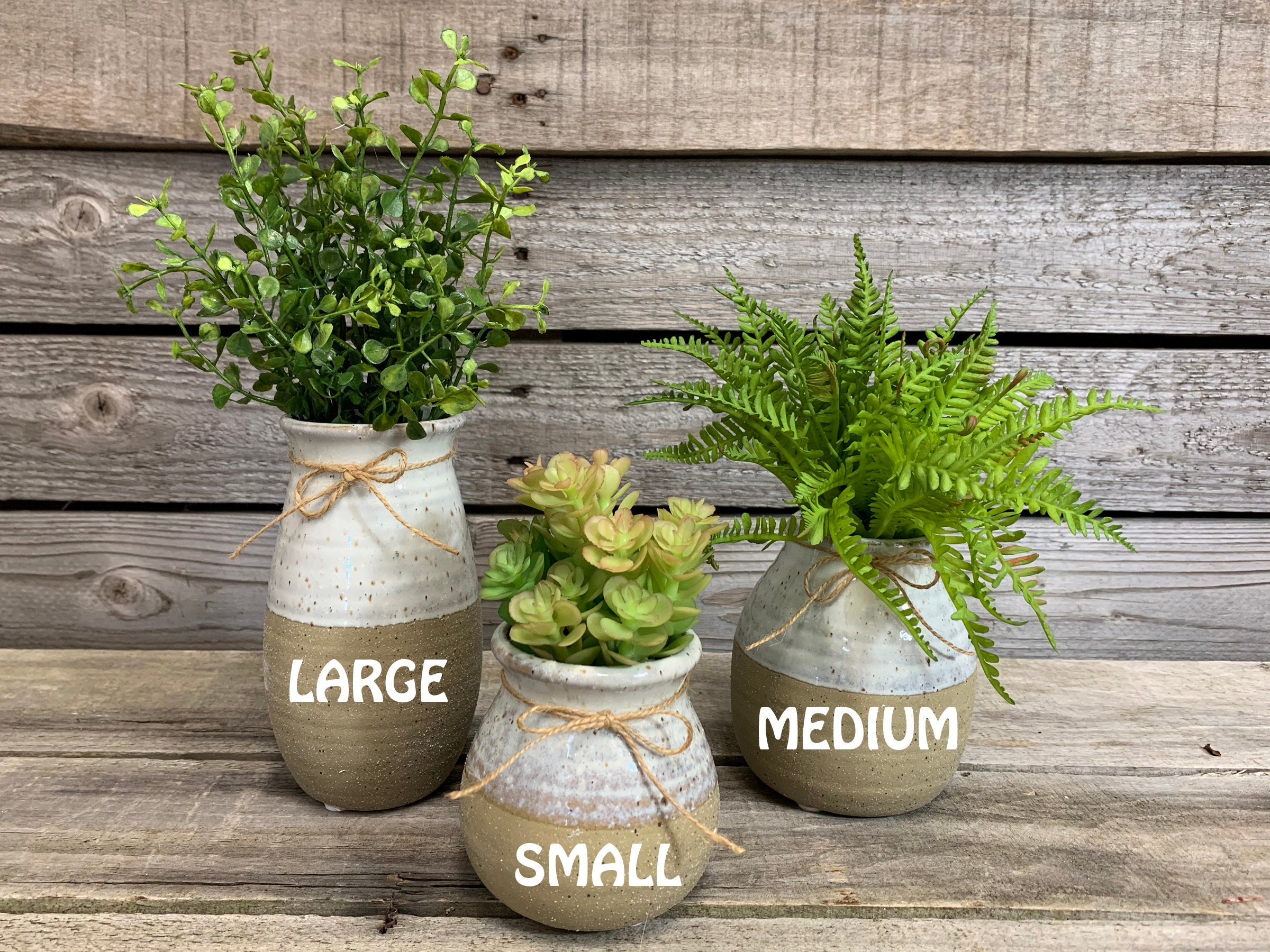 This is for 1 adorable ceramic vase with greenery. You choose which size vase you would like! Each size comes with the greenery that is pictured with it. The vase is 2 tone cream and brown and has a jute bow.